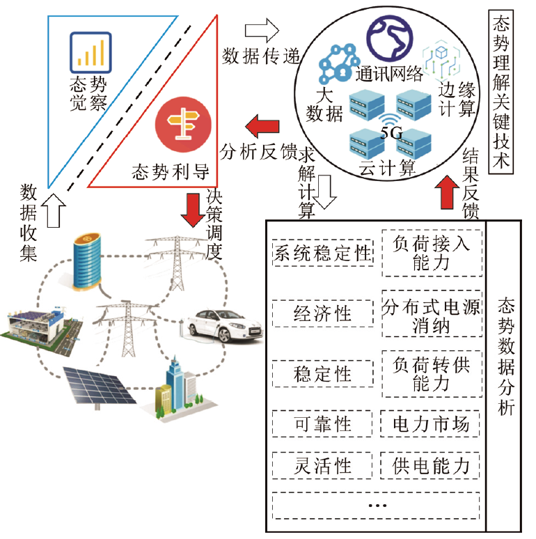 態(tài)勢理解是數(shù)據(jù)分析階段,深入理解與挖掘在態(tài)勢覺察階段中收集到的數(shù)據(jù),并從系統(tǒng)穩(wěn)定性、經(jīng)濟性、負載轉(zhuǎn)供能力、可靠性、靈活性、供電能力、負荷接入能力和分布式發(fā)電消納能力等方面分析智能配電網(wǎng)的運行態(tài)勢,其架構如下圖所示。態(tài)勢理解主要關鍵技術包括:不確定性潮流計算技術、混合狀態(tài)估計技術、配網(wǎng)彈性分析與自愈控制技術、配網(wǎng)可靠性與靈活性分析技術、配網(wǎng)協(xié)同調(diào)度技術、配網(wǎng)故障定位技術、電力市場技術、虛擬電廠技術、邊緣計算技術等。