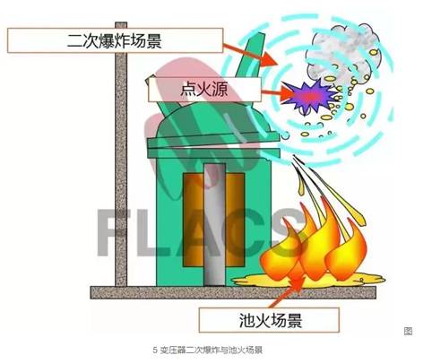 絕緣油從變壓器中泄漏并點(diǎn)燃,發(fā)生池火;氣態(tài)電解產(chǎn)物和油霧的泄漏及空氣混合,被點(diǎn)燃后發(fā)生二次爆炸。