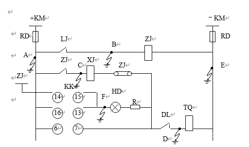 如圖所示,當直流接地發(fā)生在A、B兩點時,將電流繼電器觸點短接,而將出口中間繼電器ZJ啟動,ZJ觸點閉合而跳閘。A、C兩點接地時短接ZJ觸點而跳閘。在A、D兩點,D、F兩點兩點接地同樣都能造成斷路器跳閘。
